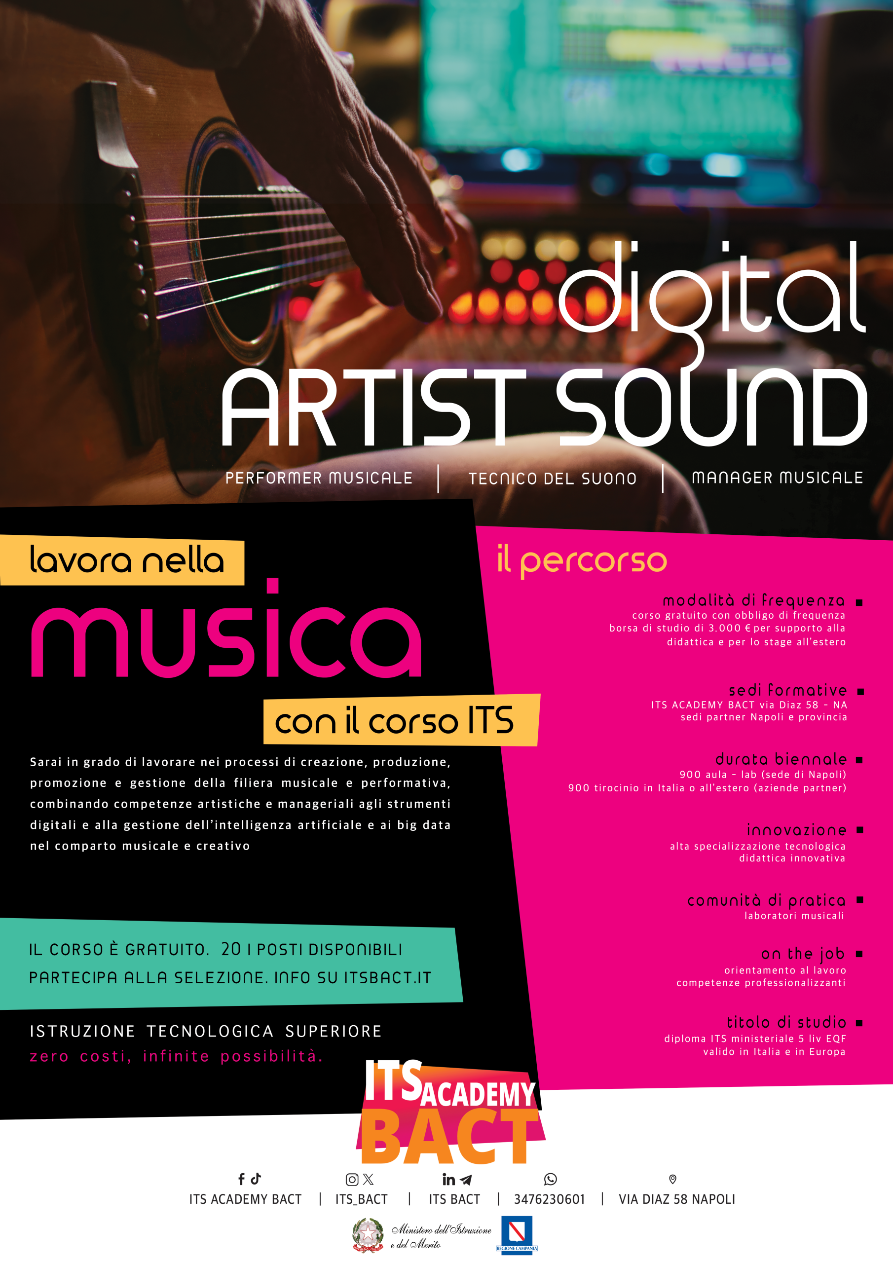 Formati e qualificati come Digital Artist Sound, partecipa alle selezioni per entrare nell’ITS Academy BACT. Il corso di Istruzione Tecnica Superiore è biennale, non prevede costi e rilascia il diploma ITS ministeriale di Tecnico Superiore per la digitalizzazione dell’Industria Culturale e Creativa